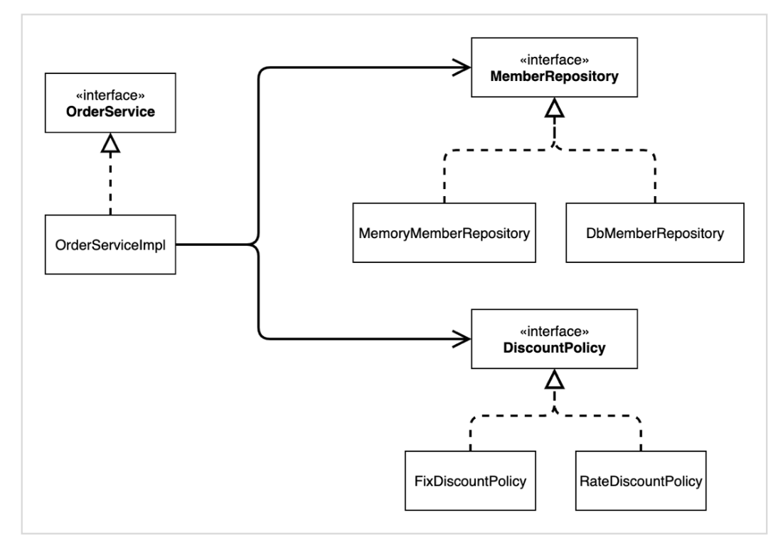 OrderServiceImpl 은 MemberRepository , DiscountPolicy 에 의존한다는 것을 알 수 있다.
