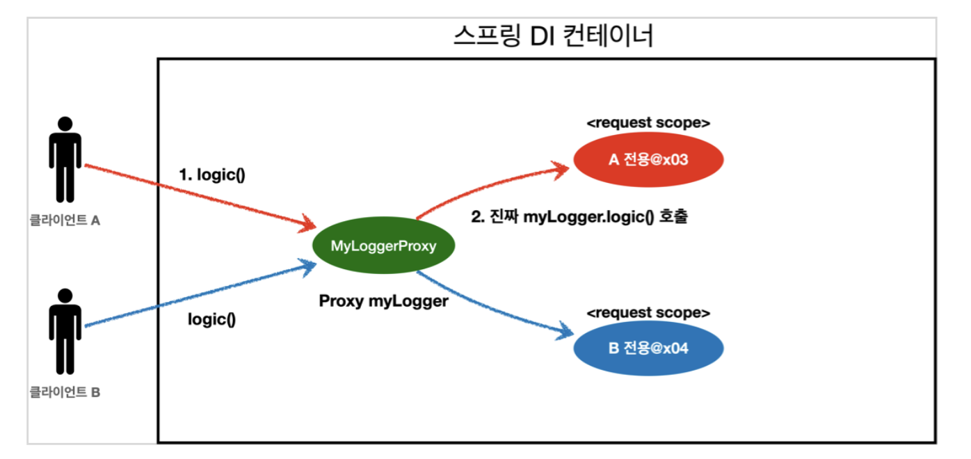(실제 MyLogger는 request의 시작에서 끝까지 유지되는 빈이지만, 프록시는 MyLogger가 사용되면 그 시점에