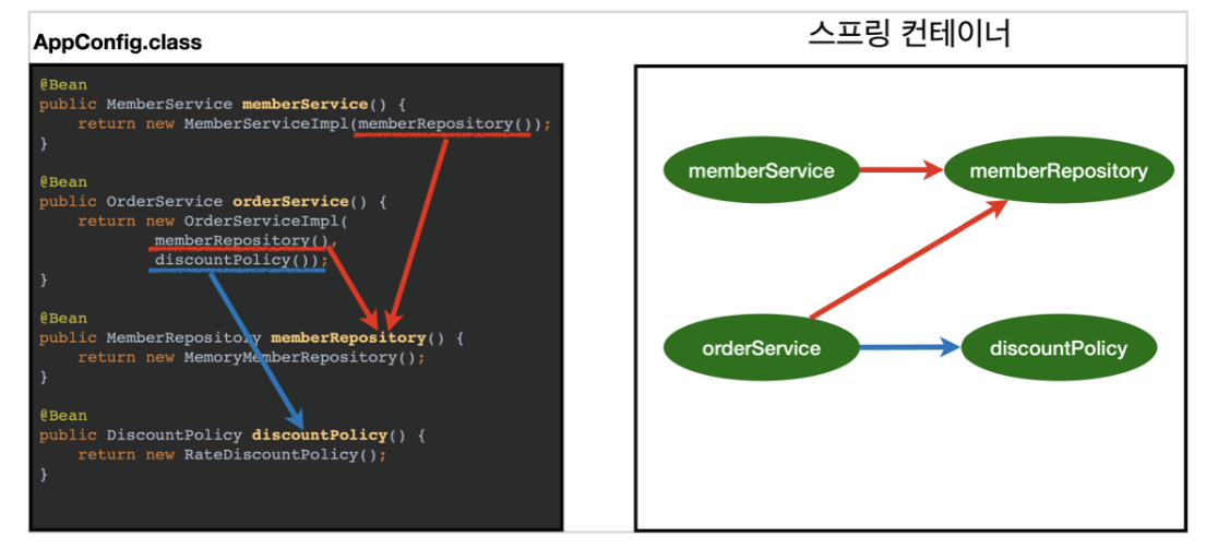 =>AppConfig가 FixDiscountPolicy 객체 인스턴스를 클라이언트 코드 대신 생성해서 클라이언트 코드에 의존관계를 주입했다.