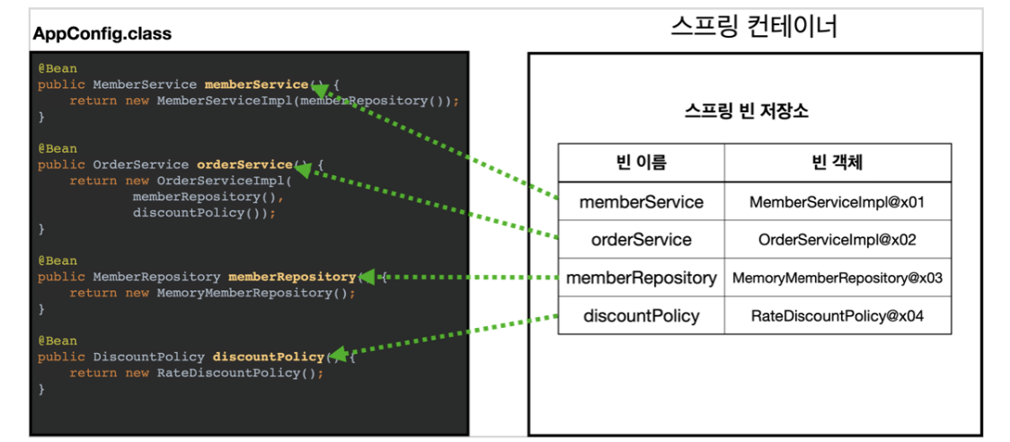 애플리케이션의 전체 동작 방식을 구성(config)하기 위해, 구현 객체를 생성하고, 연결하는 책임을 가지는 별도의 설정 클래스를 만들자.