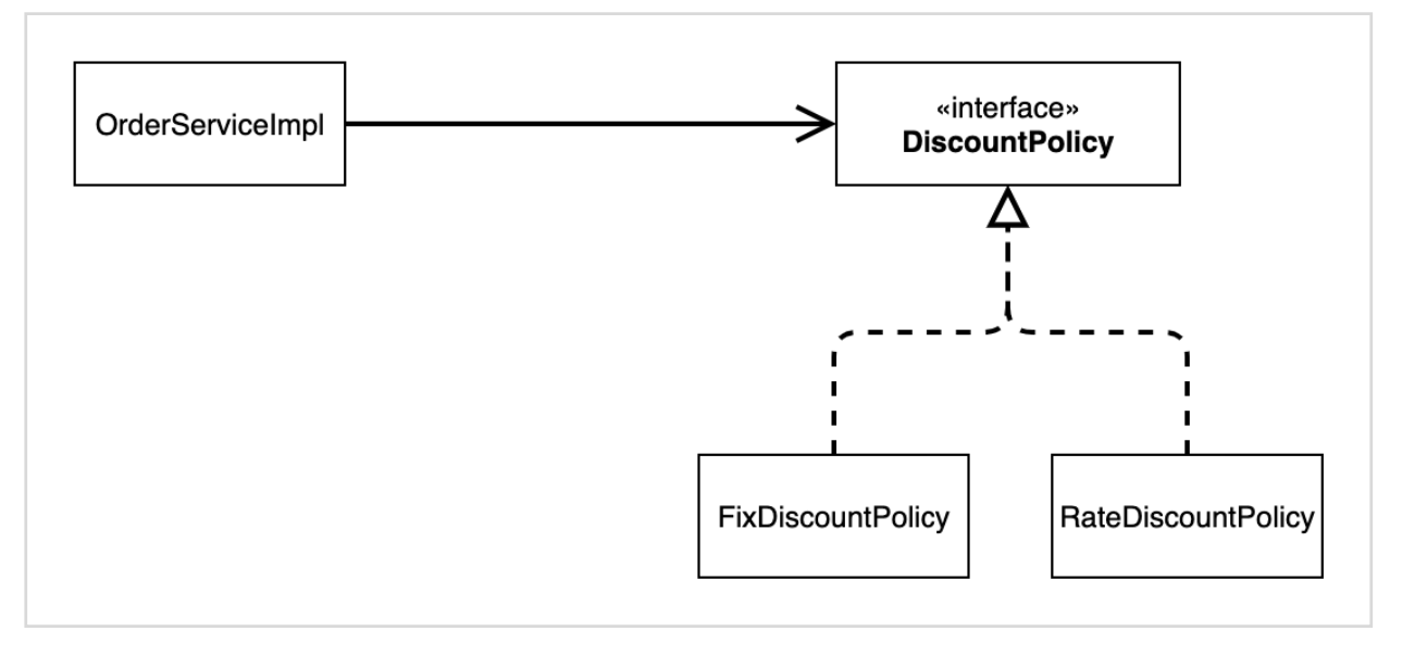 위의 구조는 애초에 스프링을 배제하고 생각한다면, 실제 구현체가 없는 DisCountPolicy라는 인터페이스에 의존하기에,