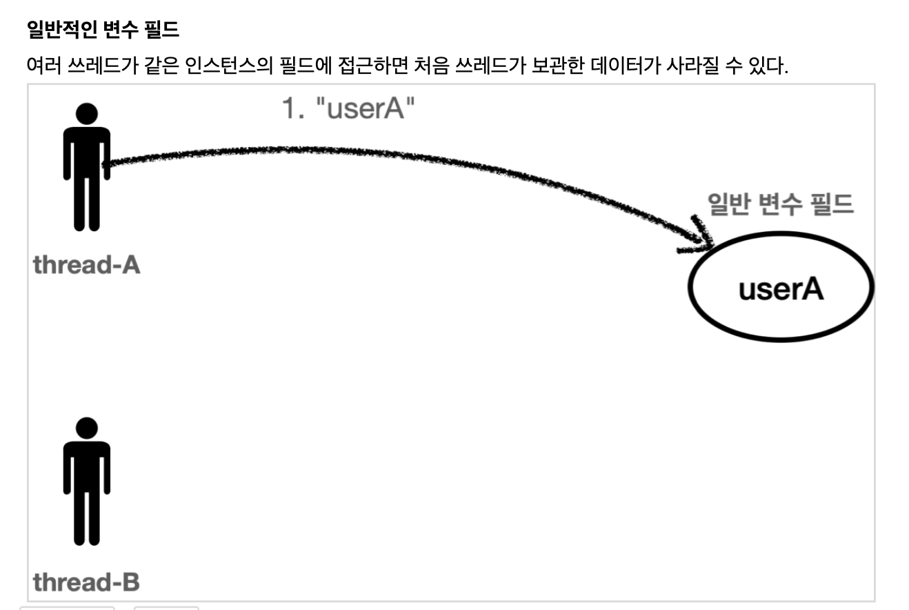 thread-B 가 userB 라는 값을 저장하면 직전에 thread-A 가 저장한 userA 값은 사라진다.