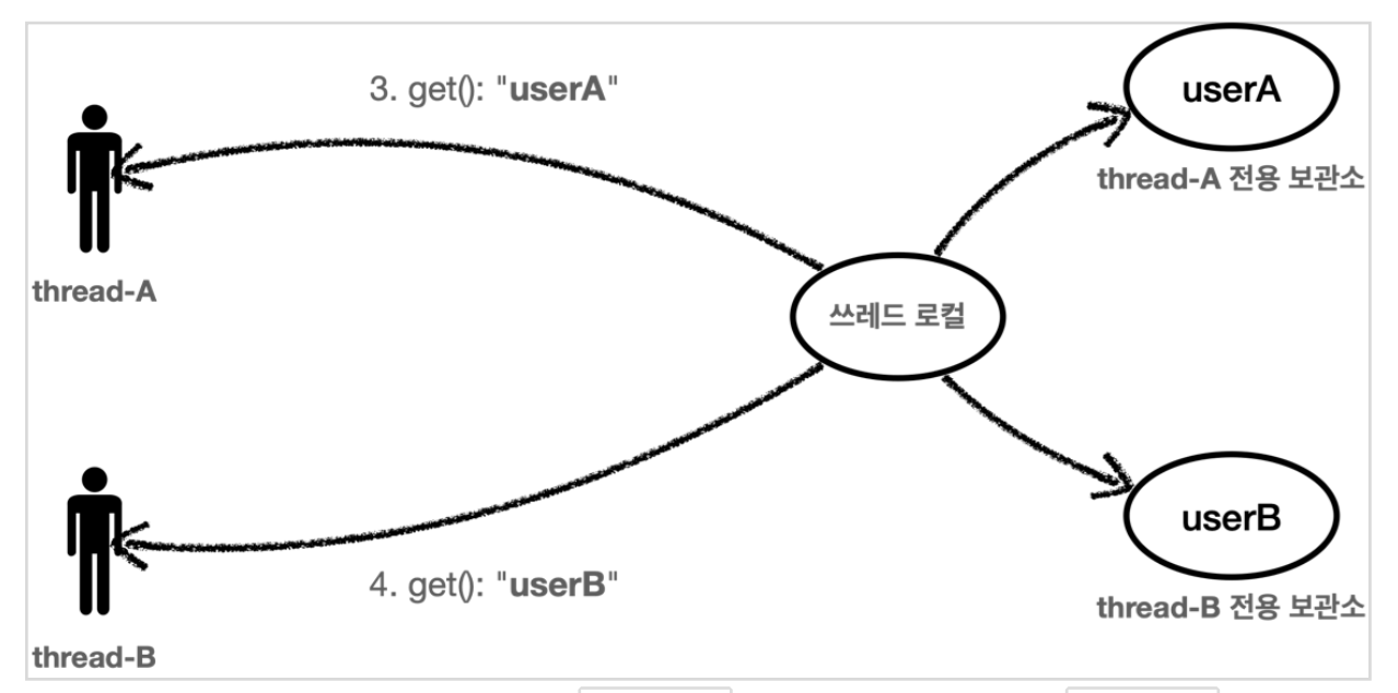 thread-A 가 userA 라는 값을 저장하면 쓰레드 로컬은 thread-A 전용 보관소에 데이터를 안전하게 보관한다.