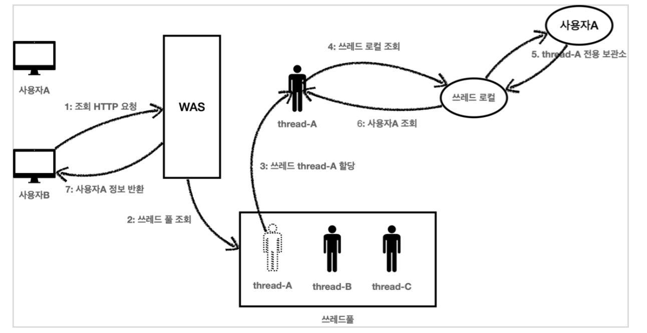 4. 이번에는 조회하는 요청이다. thread-A 는 쓰레드 로컬에서 데이터를 조회한다. 5. 쓰레드 로컬은 thread-A 전용 보관소에 있는 사용자A 값을 반환한다.