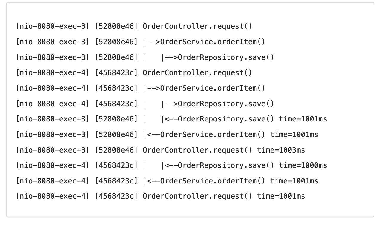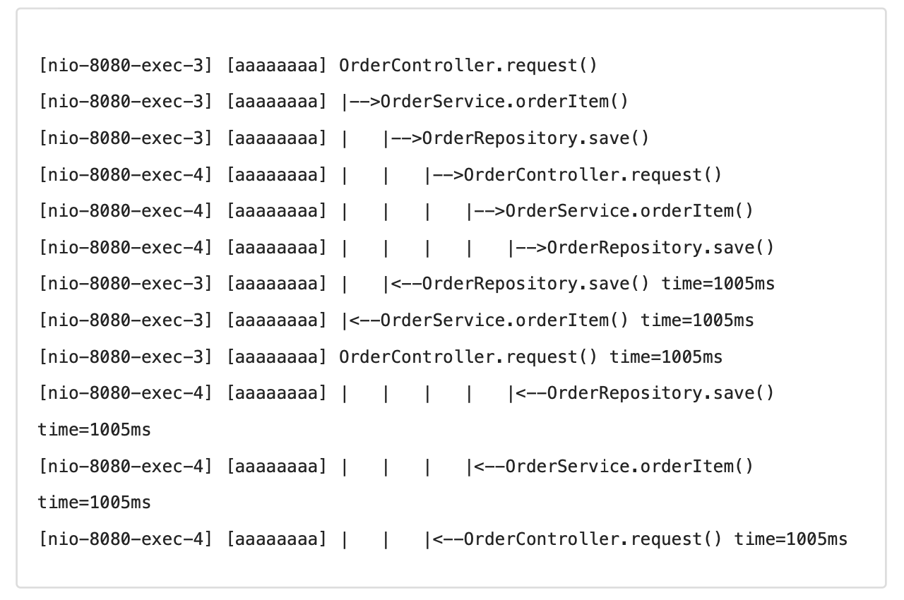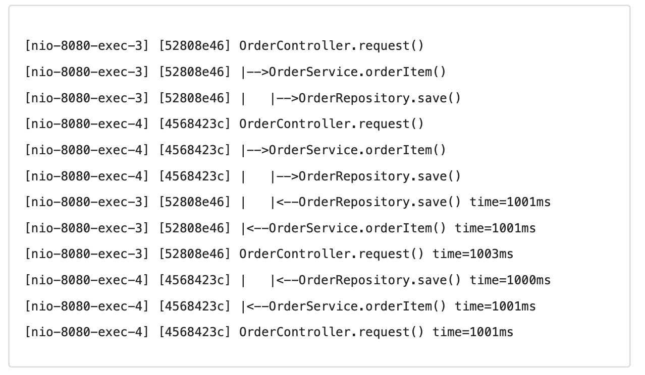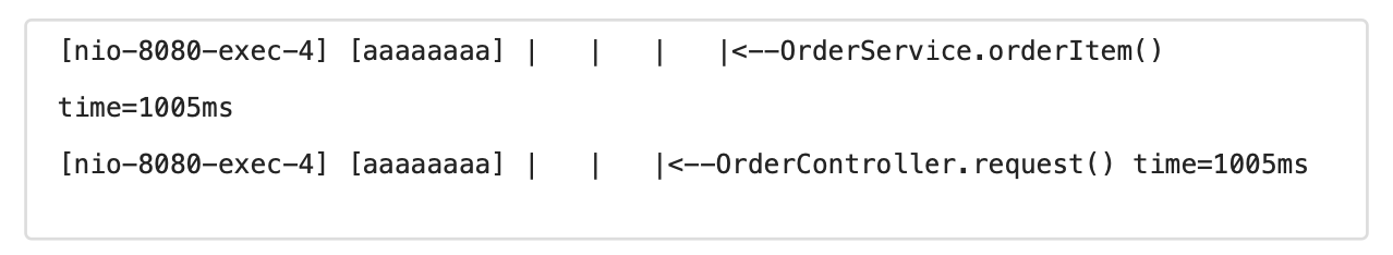 - 직전 로그가 있으면 해당 로그의 TraceId 를 참고해서 동기화하고, level 도 하나 증가한다.