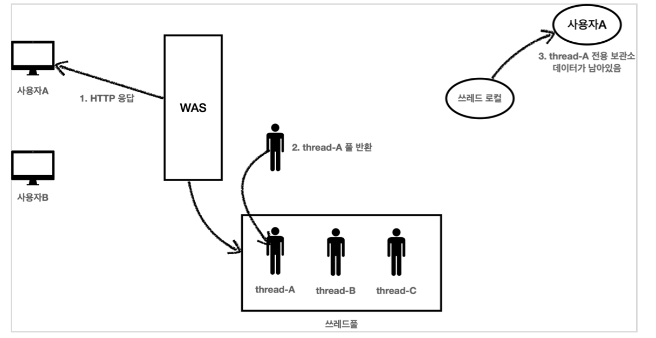 3. thread-A 는 쓰레드풀에 아직 살아있다. 따라서 쓰레드 로컬의 thread-A 전용 보관소에 사용자A 데이터도 함께 살아있게 된다.