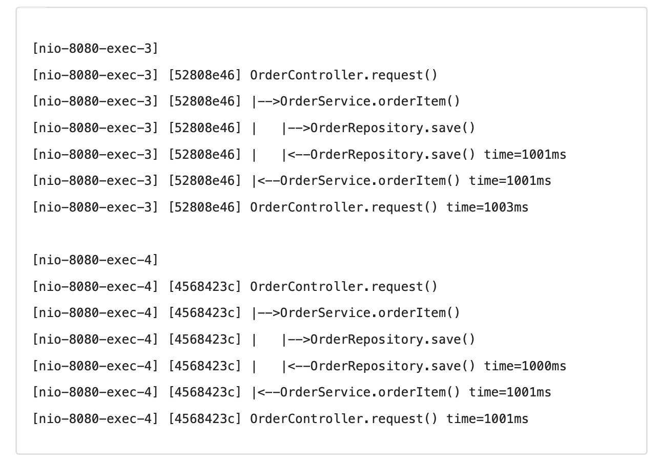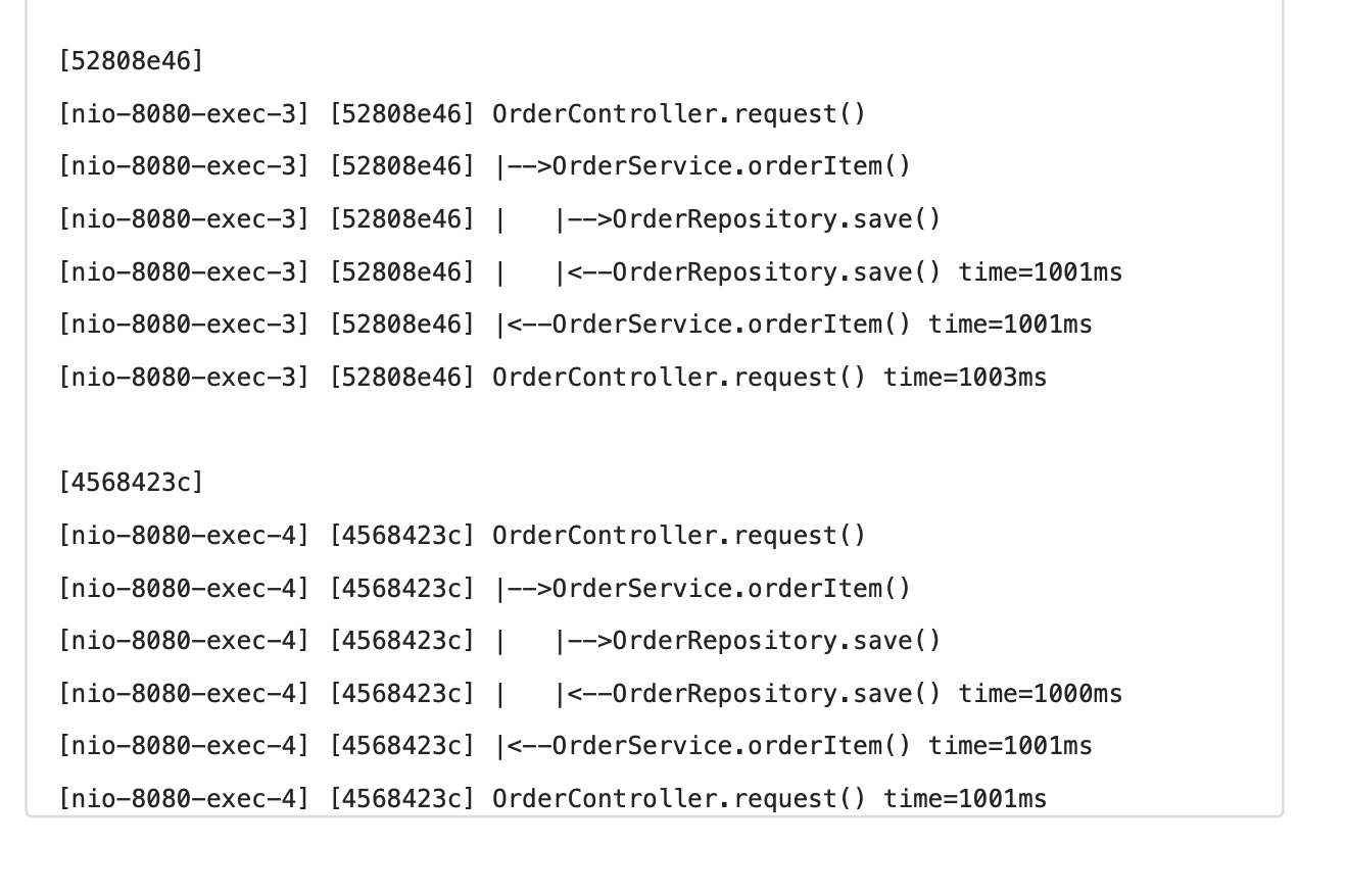 동시에 여러 사용자가 요청하면 여러 쓰레드가 동시에 애플리케이션 로직을 호출하게 된다. 따라서 로그는 이렇게 섞여서 출력된다.