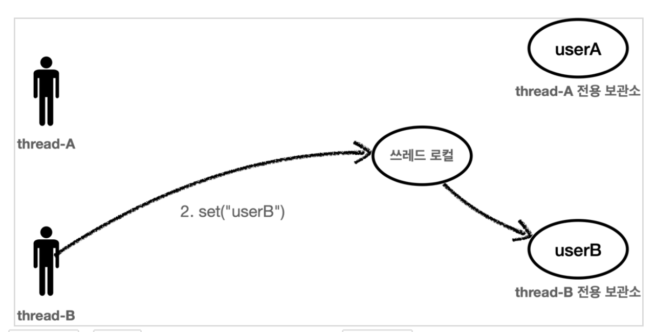 thread-B 가 userB 라는 값을 저장하면 쓰레드 로컬은 thread-B 전용 보관소에 데이터를 안전하게 보관한다.