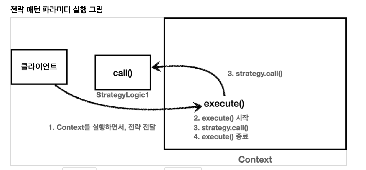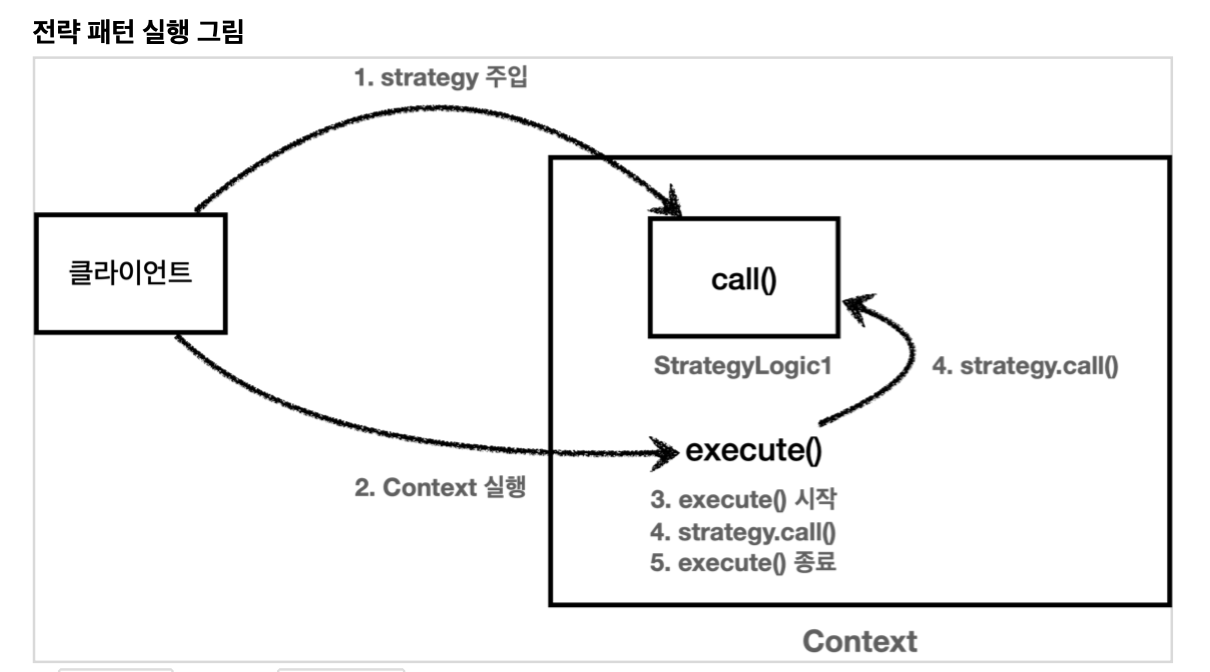 전략: 이제 Context( 공통 불변 ) stretegy(가변, 로직 코드 ) 사용. 인터페이스를 통해 추상화에 의존하여 템플릿 메소드 패턴의 문제 해결