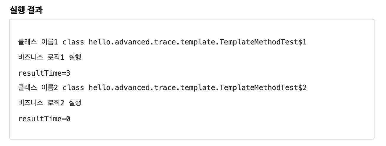 실행 결과를 보면 자바가 임의로 만들어주는 익명 내부 클래스 이름은 TemplateMethodTest$1 , TemplateMethodTest$2 인 것을 확인할 수 있다.