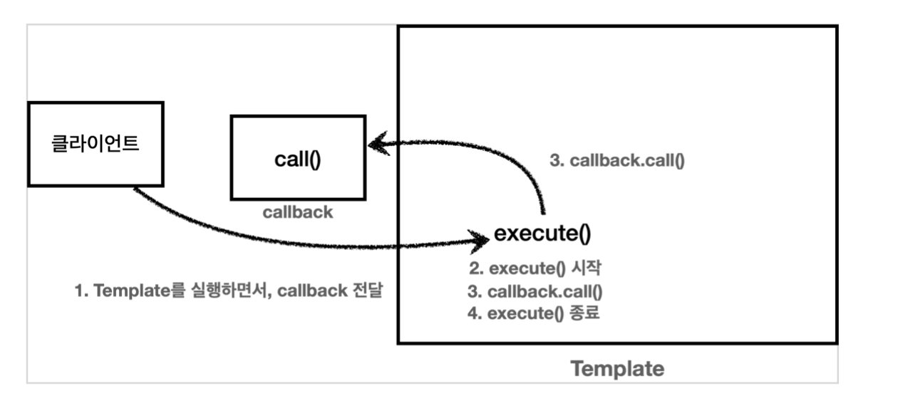 템플릿 콜백: 전략이 실시간으로 계속, 많이 변할 때 좋다. (전략 패턴과 유사하지만, 파라미터로 콜백 메서드를 전달하여 template에서 해당 콜백 메서드를 통해 공통적인 부분은 기존에 가지고 있던 라인으로 수행하고, 가변적인 영역을 받아온 콜백 메서드를 통해 수행한다.
