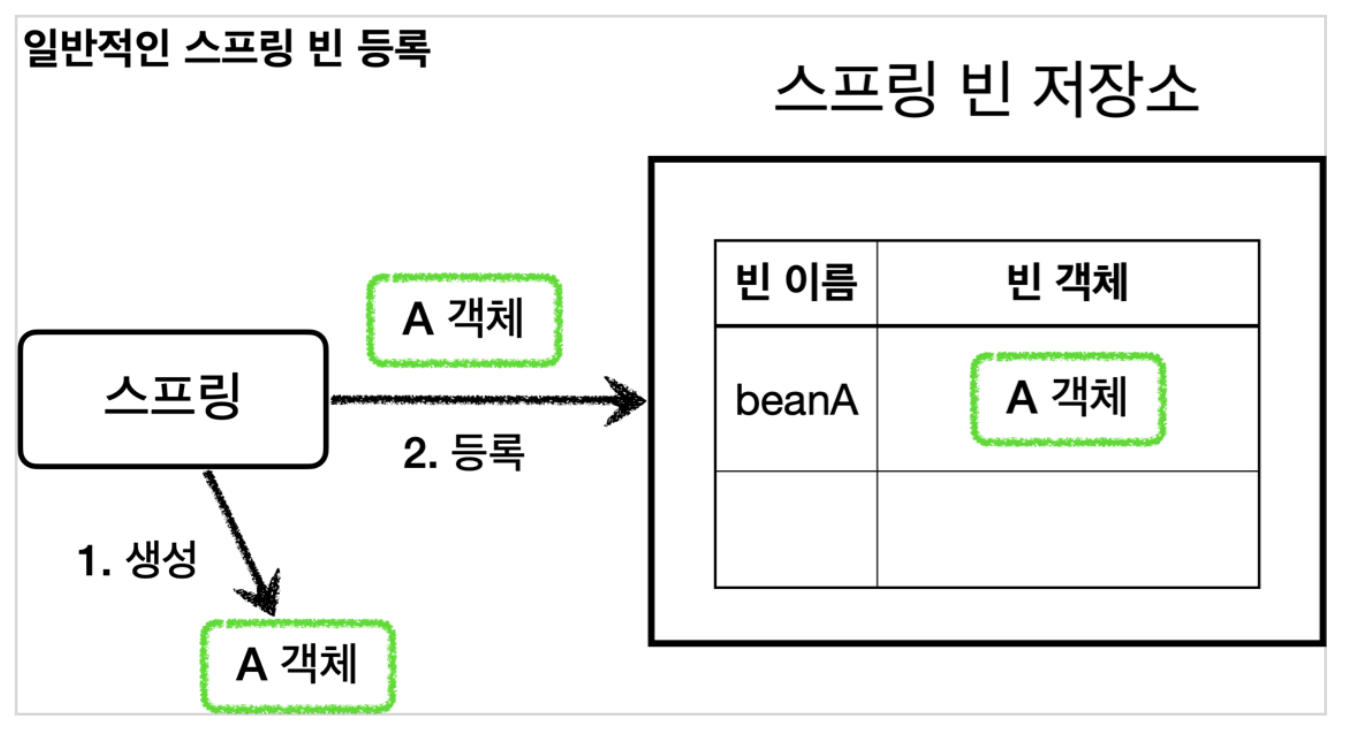 @Bean 이나 컴포넌트 스캔으로 스프링 빈을 등록하면, 스프링은 대상 객체를 생성하고 스프링 컨테이너 내부의 빈 저장소에 등록한다. 그리고 이후에는 스프링 컨테이너를 통해 등록한 스프링 빈을 조회해서 사용하면 된다.