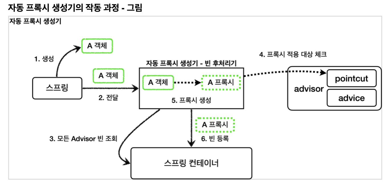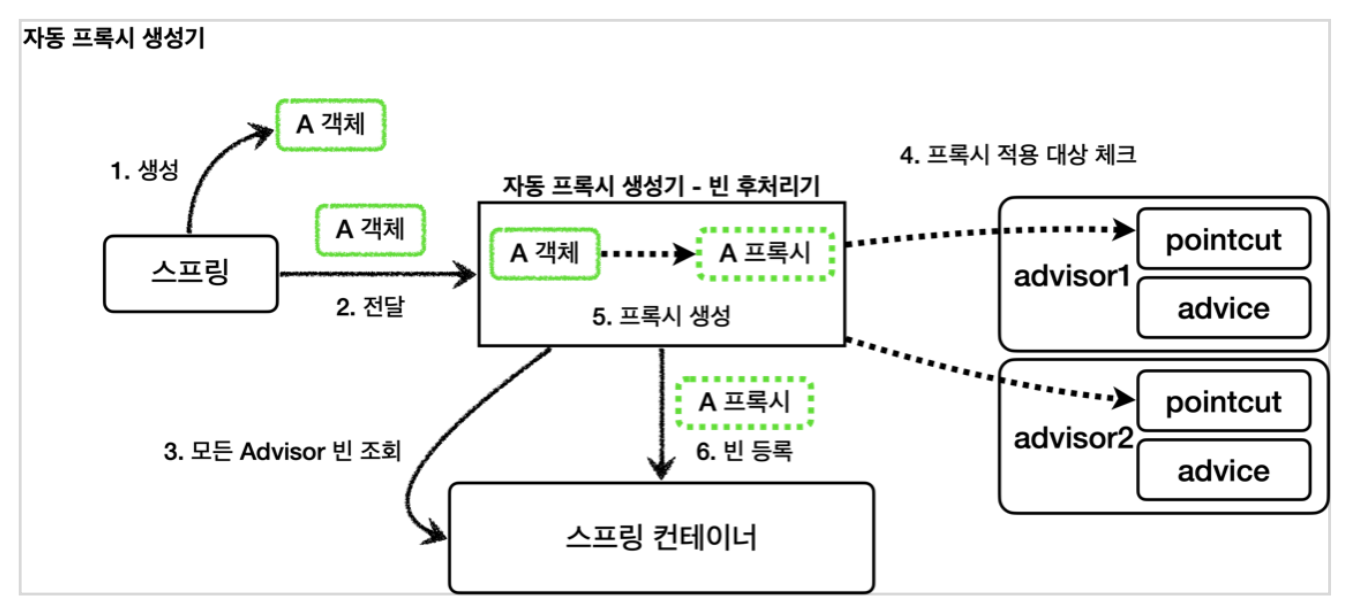 - 이 빈 후처리기는 스프링 빈으로 등록된 Advisor 들을 자동으로 찾아서 프록시가 필요한 곳에 자동으로 프록시를 적용해준다.