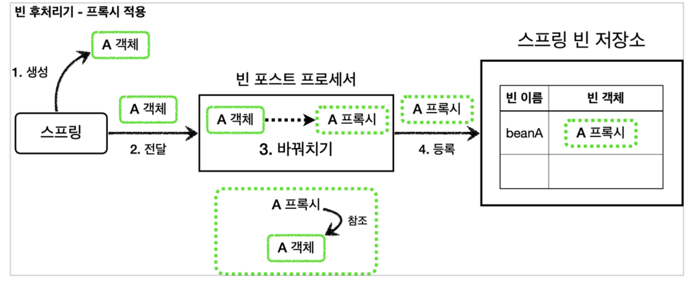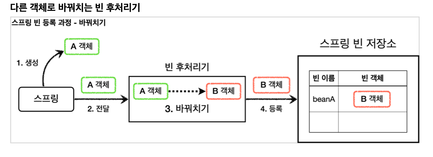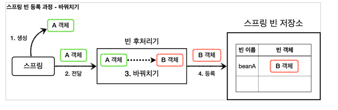 4. 등록: 빈 후처리기는 빈을 반환한다. 전달 된 빈을 그대로 반환하면 해당 빈이 등록되고, 바꿔치기 하면 다른 객체가 빈 저장소에 등록된다.