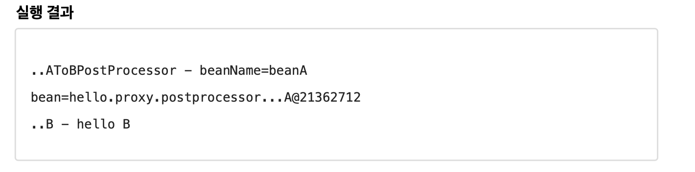 여기서 A 대신에 반환된 값인 B 가 스프링 컨테이너에 등록된다. 다음 실행결과를 보면 beanName=beanA , bean=A 객체의 인스턴스가 빈 후처리기에 넘어온 것을 확인할 수 있다.