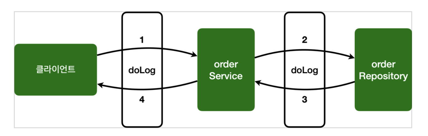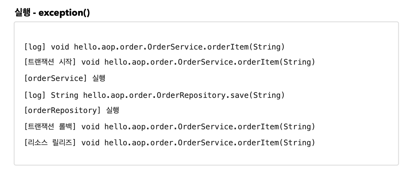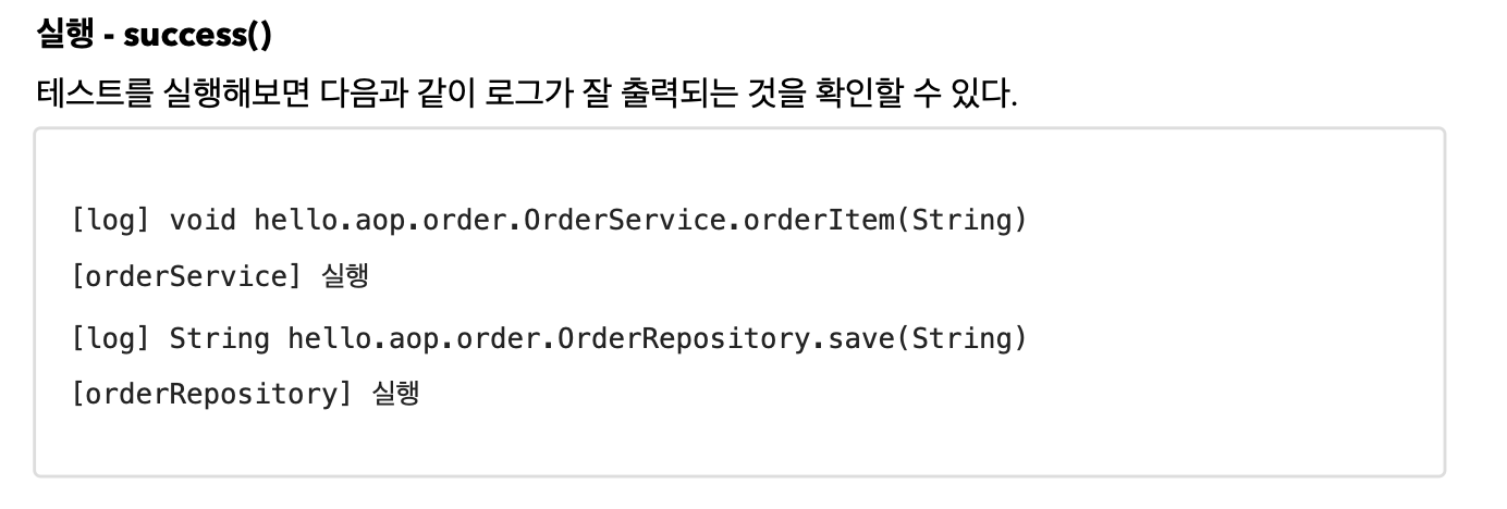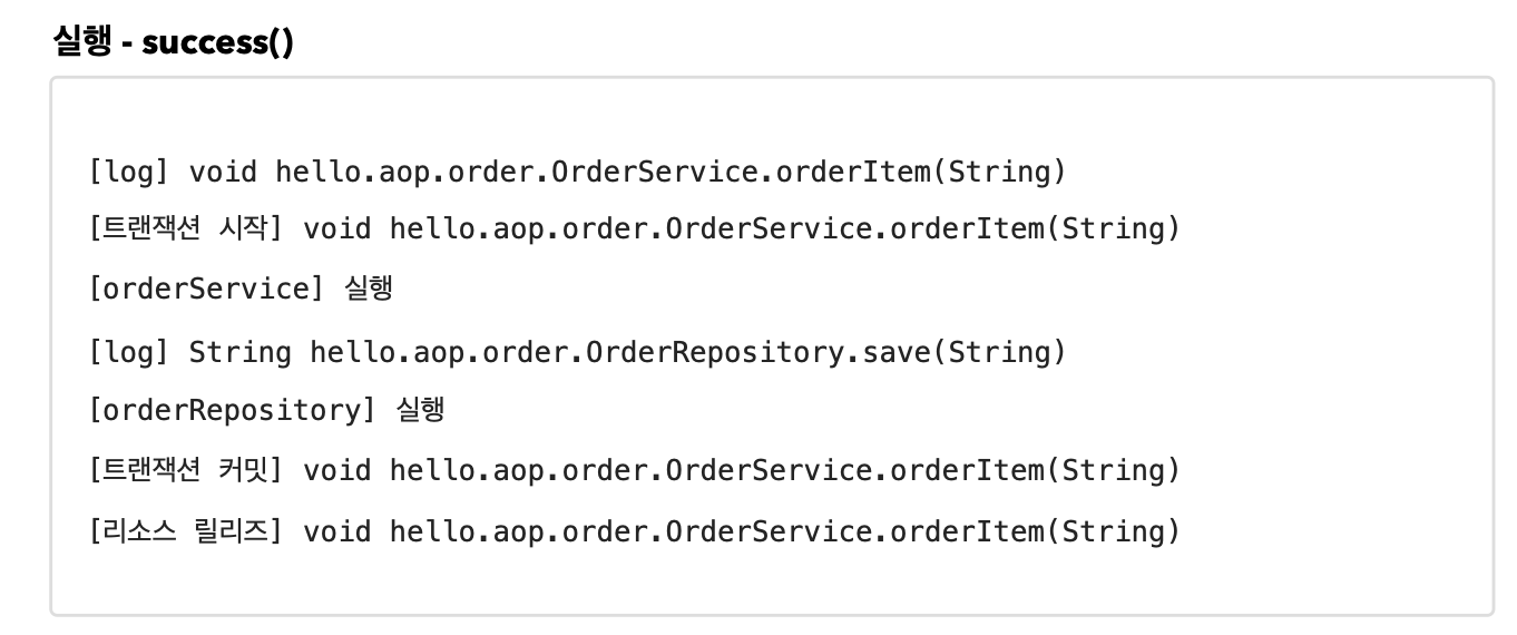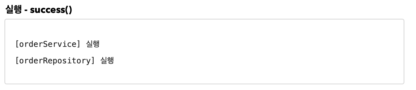 - 이제 OrderService , OrderRepository 의 모든 메서드는 AOP 적용의 대상이 된다. 참고로 스프링은 프록시 방식의 AOP를 사용하므로 프록시를 통하는 메서드만 적용 대상이 된다.