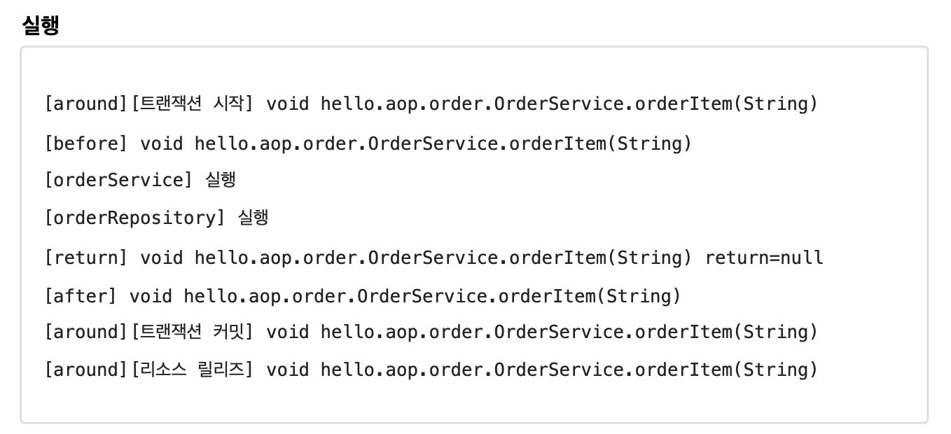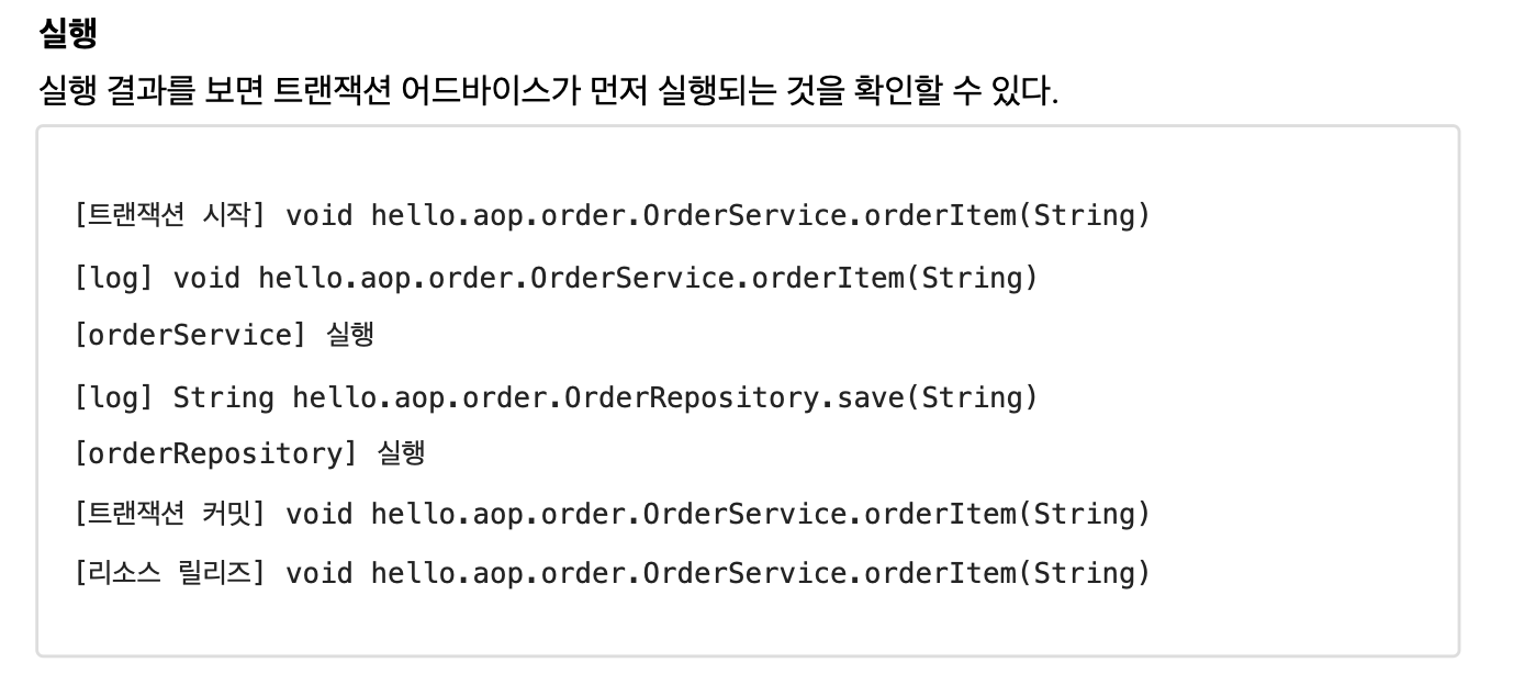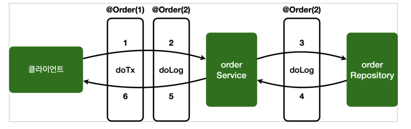 물론 @Aspect 안에 동일한 종류의 어드바이스가 2개 있으면 순서가 보장되지 않는다. 이 경우 앞서 배운 것 처럼 @Aspect 를 분리하고 @Order 를 적용하자.