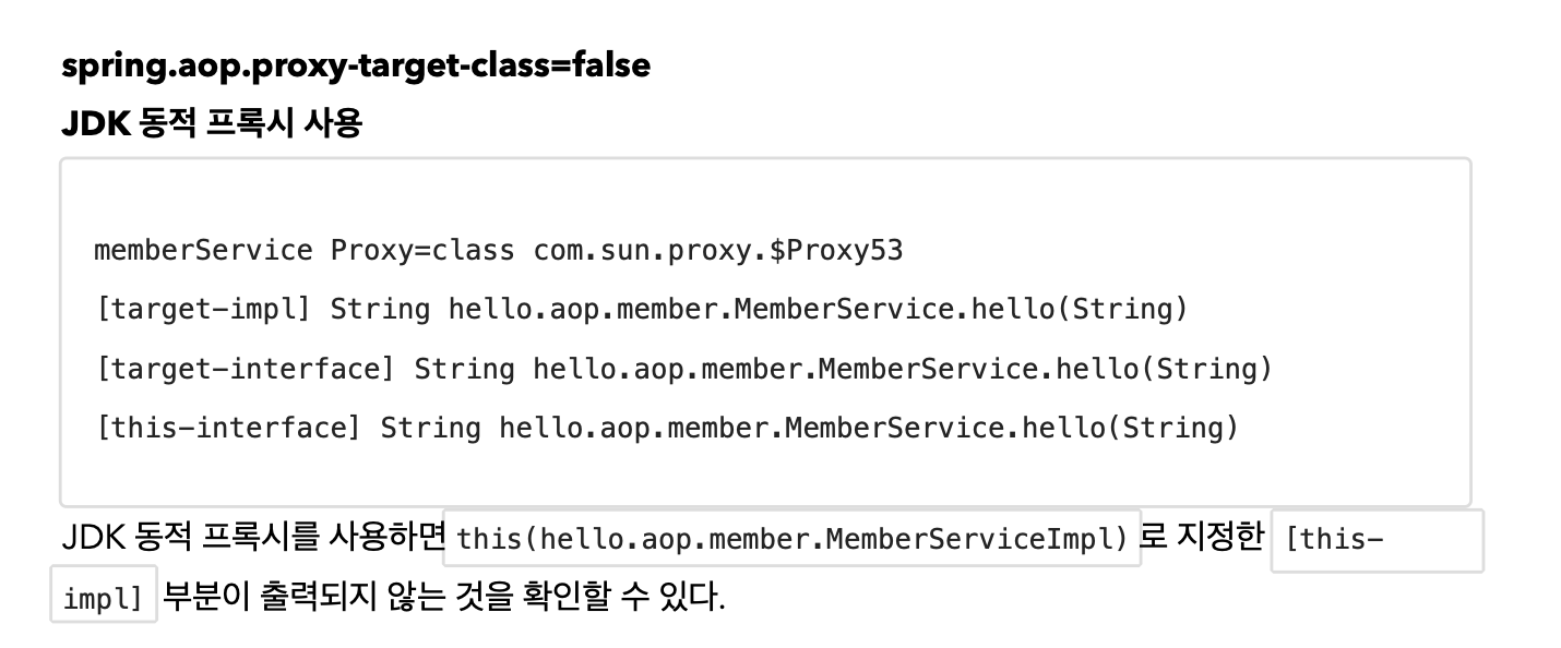 프록시를 대상으로 하는 this 의 경우 구체 클래스를 지정하면 프록시 생성 전략에 따라서 다른 결과가 나올 수 있다는 점을 알아두자.