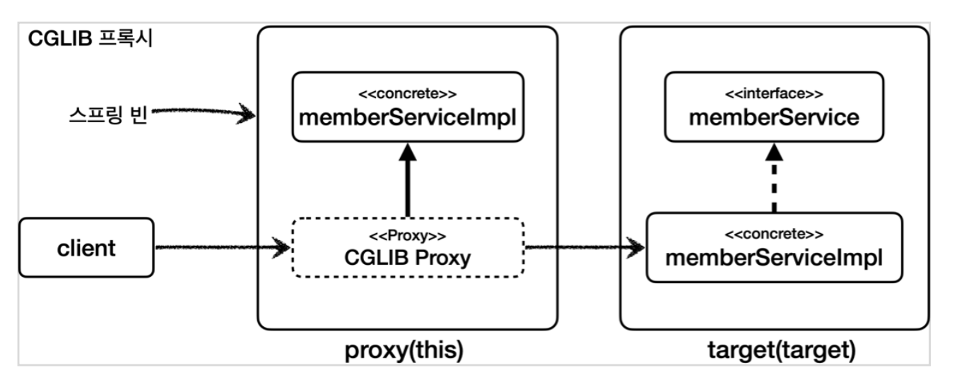 - CGLIB: 인터페이스가 있어도 구체 클래스를 상속 받아서 프록시 객체를 생성한다.