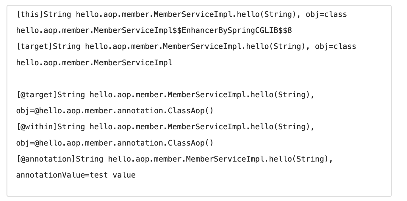 - this()로 프록시 정보를 받아오거나, target() 으로 실제 객체, 그리고 annotation()로 애노테이션 정보도 받아올 수 있다.