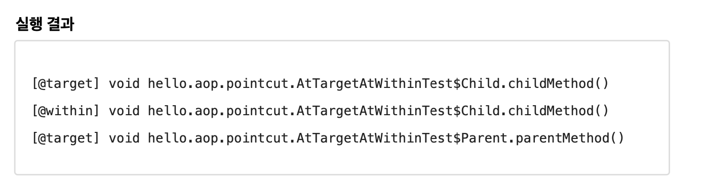 - @within: 해당 어노테이션이 child에 있다면, child에만 적용