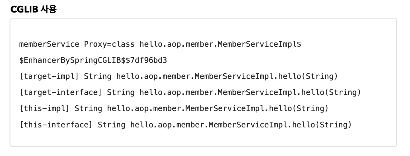 - 실제 객체: 실제 객체 (memberServiceImpl ): this의 파라미터로 들어온 타입인 memberServiceImpl가 memberServiceImpl 일치하기에 AOP가 적용된다