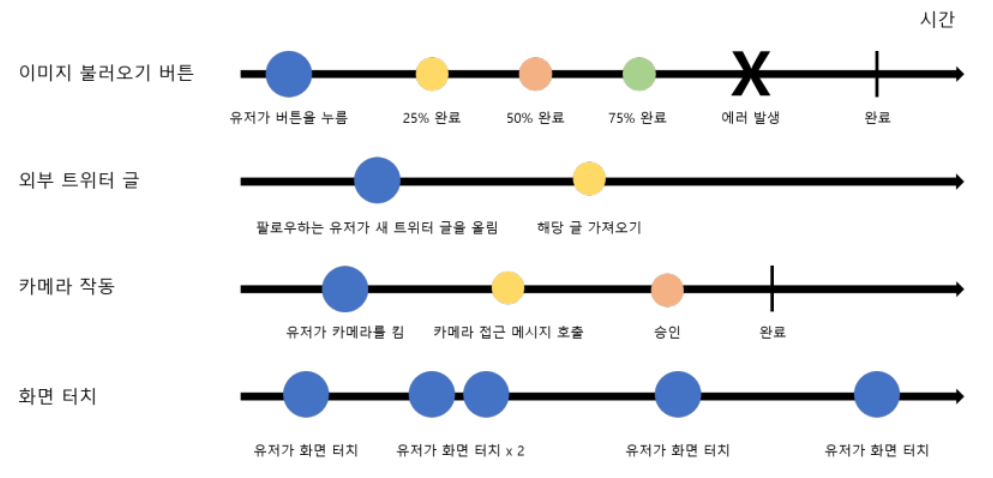 ex) 유저가 앱을 로그인, 이미지를 조회, 카메라를 작동, 이미지를 업로드 등 다양한 행위가 서버와 교신할 때마다 알게 모르게 비동기적 이벤트로써 발생하게 된다.