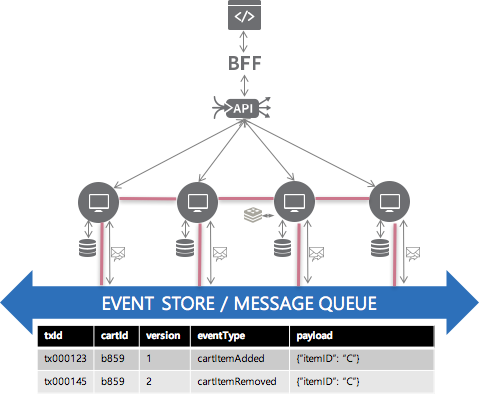 - 데이터 변경 이벤트 및 보상 트랜잭션 처리를 위한 이벤트는 메세지 큐를 통해 동작