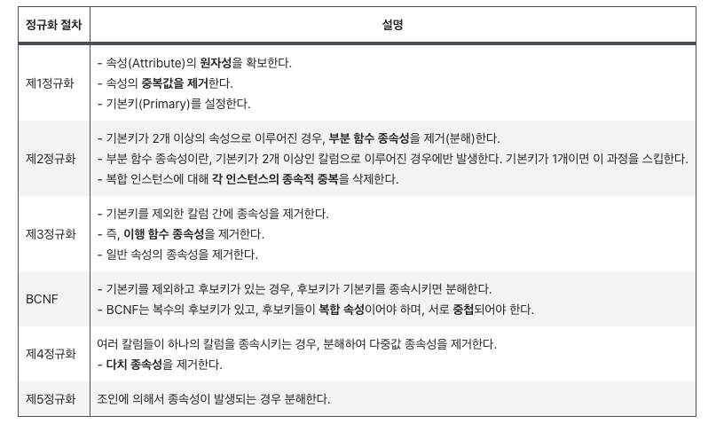 - 정규화는 데이터의 일관성, 최소한의 데이터 중복, 최소한의 데이터 유연성을 위한 방법이며 데이터를 분해하는 과정이다.