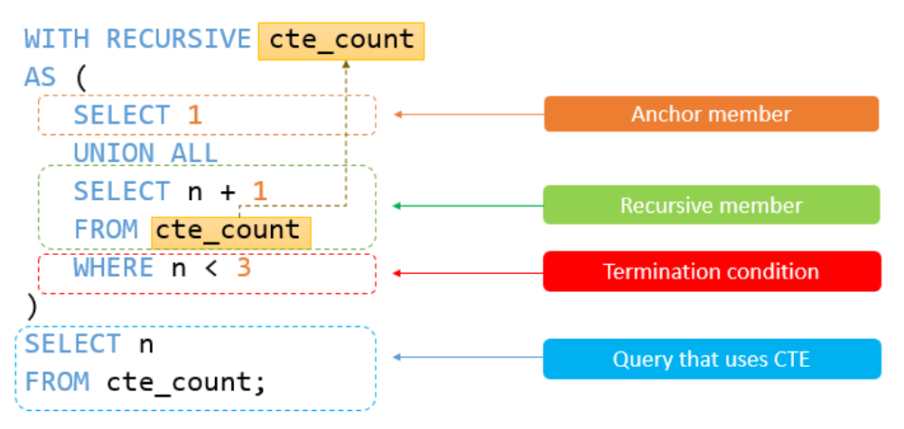 아래와 같이, sql 에서도 WITH RECURSIVE 테이블 AS ~를 통해 재귀를 사용할 수 있다.
