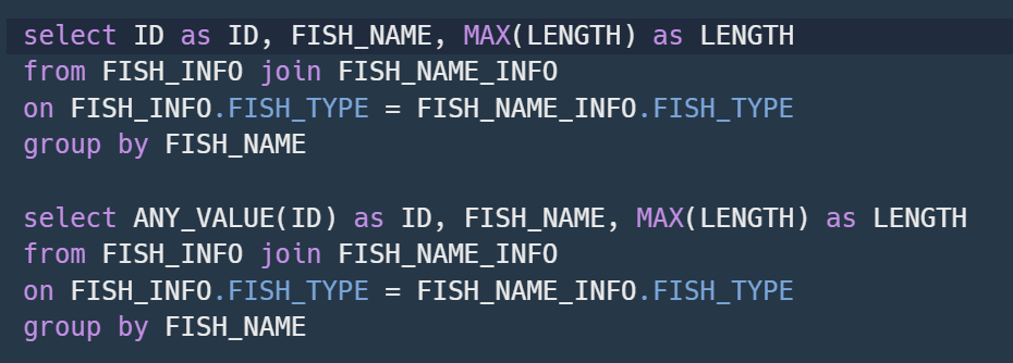 ex) NAME으로 group by 하면, 각 name 간에 서로 다른 ID 가 너무 많다. 따라서 ANY_VALUE 등으로 표기해줘야함