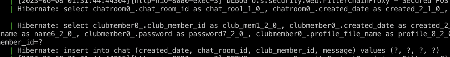 채팅방 객체를 생성하기 위해 chatroom, member의 엔티티를 select하는 sql이 각각 수행되고, 해당 채팅을 db에 insert하는 명령어가 수행된다.