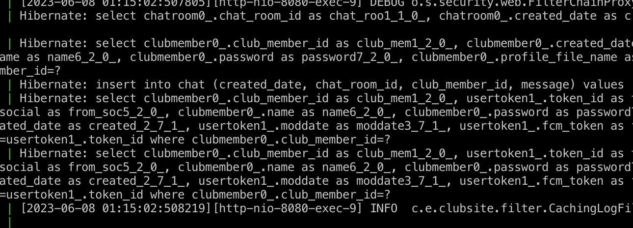 마지막으로 채팅 메세지를 담은 Chat 테이블의 경우, ClubMember(유저), ChatRoom(채팅방)과 관계를 가지는데, 채팅이 추가될 때마다 유저, 채팅방 테이블을 select하고 Chat을 생성하는 3번의 쿼리가 발생한다.