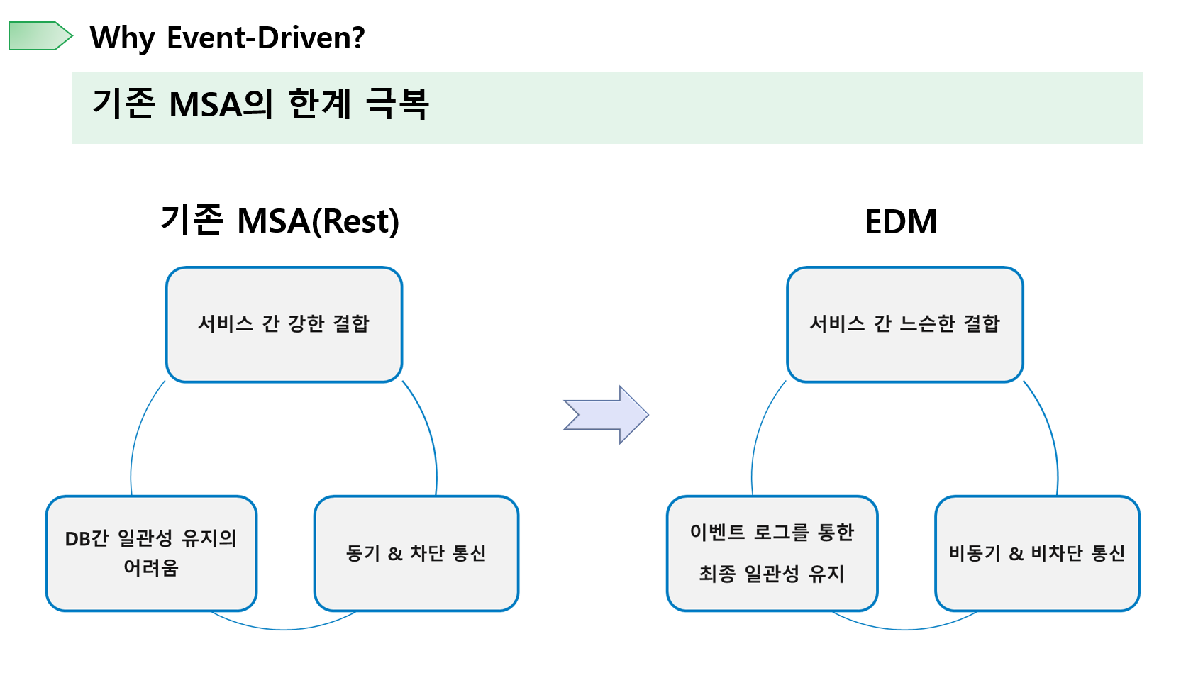 이는 모놀로식 아키텍처가 단일 DB를 사용하는 것과 다르게,MSA가 서비스 별로 개별적인 DB를 가지는 DataBase Per Service를 추구하기 때문입니다.