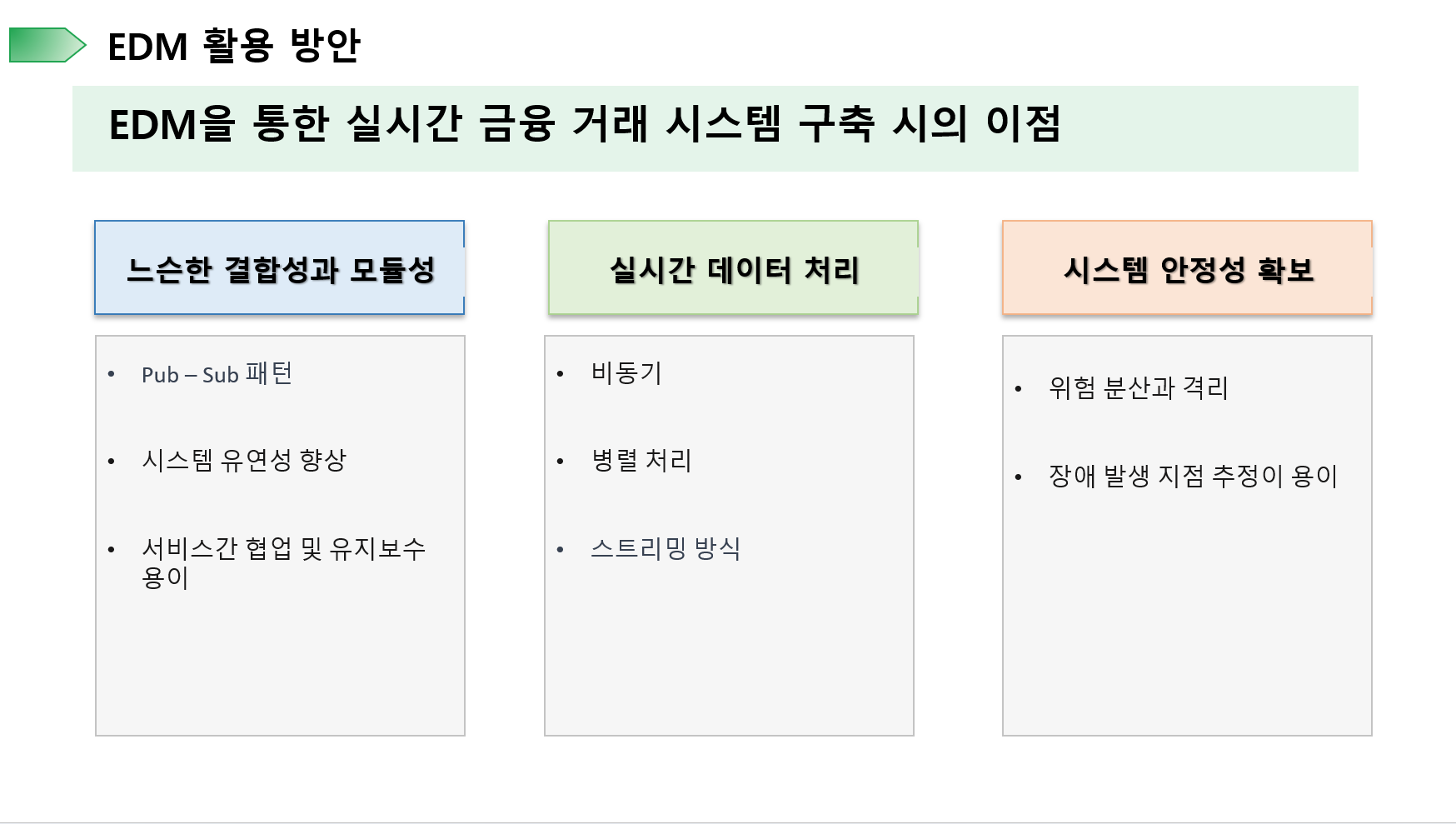 이와 같이 EDM 아키텍처를 통해 거래 처리 시스템을 구성한다면 다음과 같은 이점을 얻을 수 있습니다.