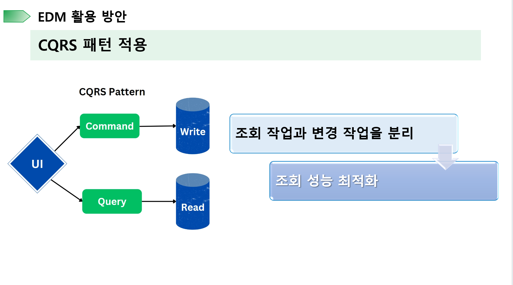CQRS패턴을 통해 읽기와 쓰기 작업 각각에 특화된 스토리지와 로직을 사용하여 성능을 최적화할 수 있습니다.
