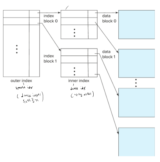 - Sparse index(outer index) 가 하위의 index 가르키고, 가장 아래에는 실제 데이터 보유한 dense index(inner index)로 실제 block의 모든 위치를 가르키게 한다.