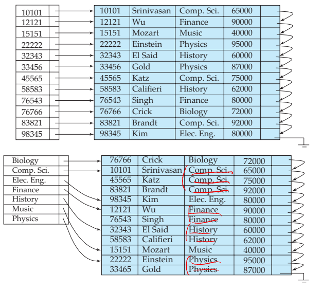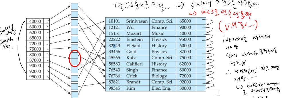 - Secondary index: (non clustering): search key 에 포인터가 붙어있는 것.