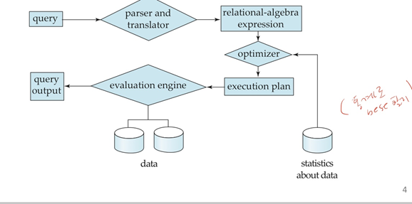1) Parsing and translation: query를 internal form으로 바꾸고, relation algebra로 Translate //