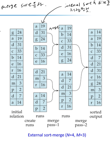disk의 table을 main memory에 올릴 수 있는 크기로 나누어서 internal sort를 하고 file로 저장한다. 이렇게 저장된 것을 run이라고 하며 run들을 merge를 하게 되면 특정한 칼럼에 대해 정렬할 수 있다. ( merge sort 와 유사. 메모리에 올라갈 때까지 쪼갠 뒤, 메모리에서 sort 하며 merge한다)