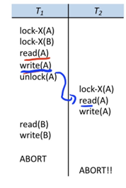 (T1이 abort되어 업데이트 한 값이 무용지물 될 수 있다) >>대기했다가 연쇄적인 abort 발생