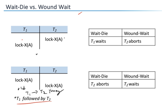 긴 트랜잭션 T1, 짧은 트랜잭션 T2, 순서가 T1> T2일시