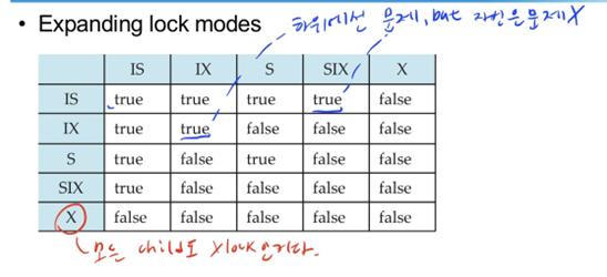 - X lock을 S lock으로 변경 가능 (downgrade)>> write 쓰고 나서, 다시 S lock으로 변경해 concurrency 증가.