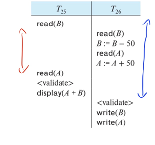 T26의 validate phase: 파란영역 사이에 T25가 종료됨. 따라서 T25의 read, write set 과 대조