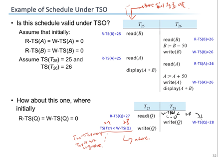 TS(T) < timestamp(Q) 라면, 오래된 값을 write 하려고 하는 것이기에, 하면 안된다.