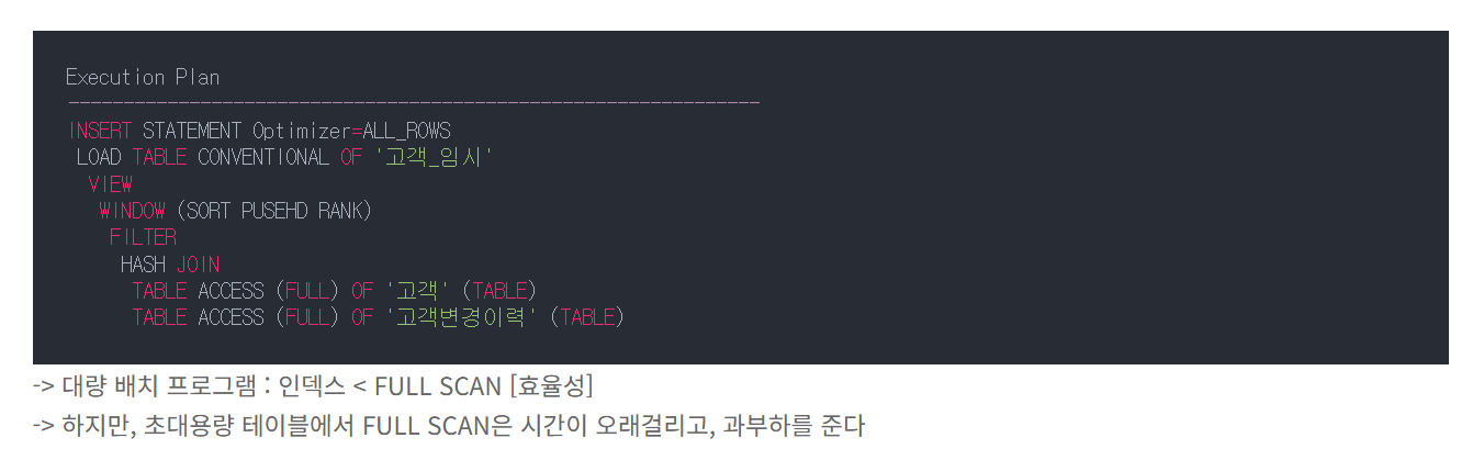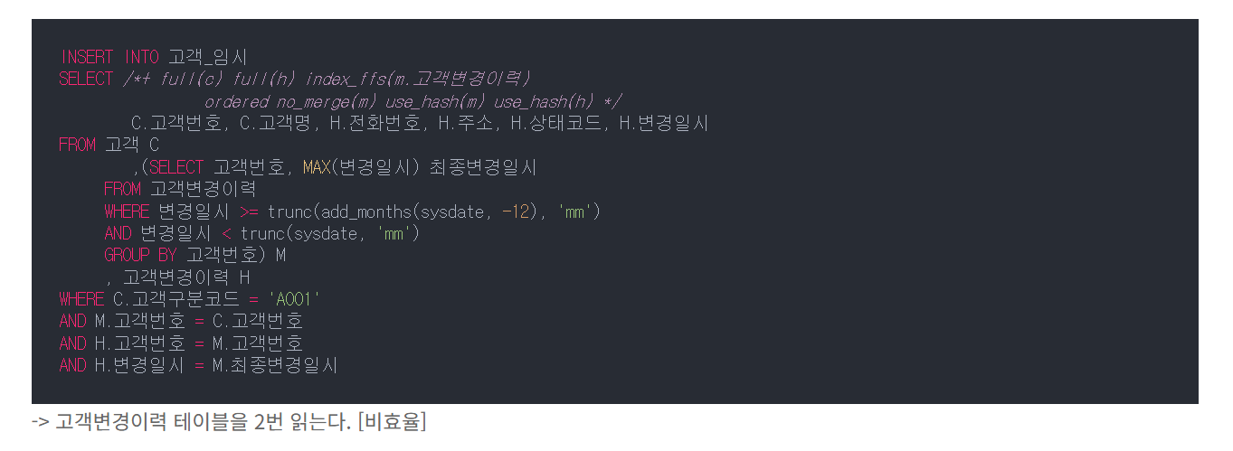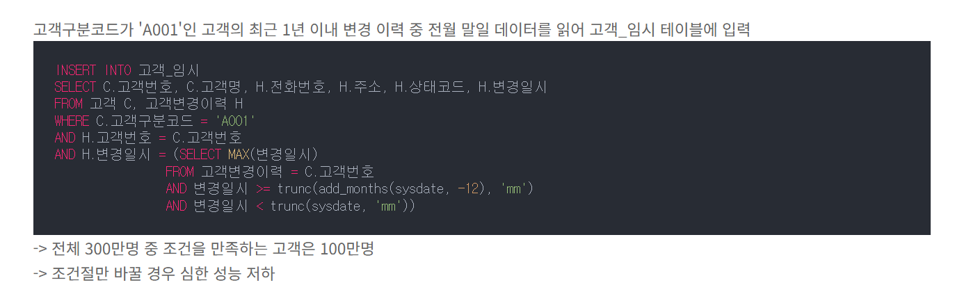 아래와 같이, 기존 온라인 프로그램에서 사용한 쿼리에서 조건절만 바꿔서 사용하면 비효율이 생긴다.