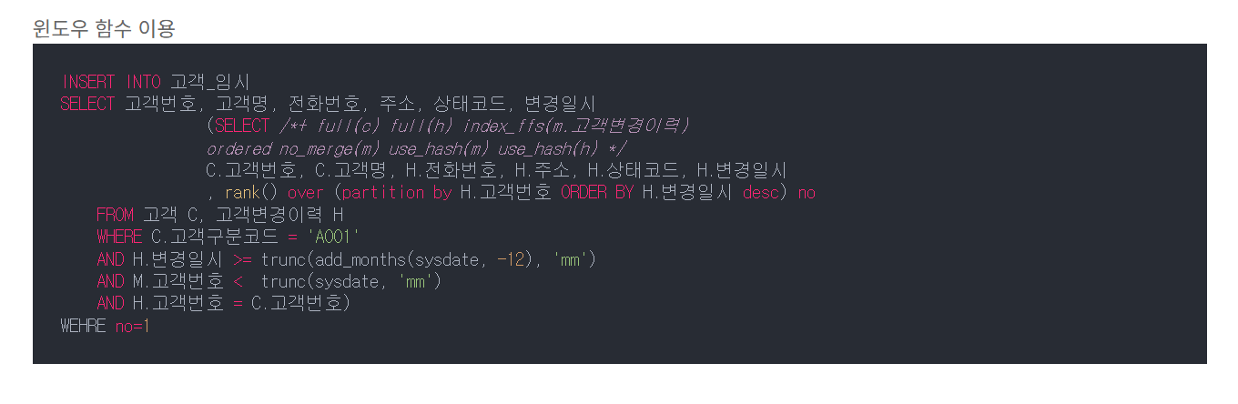 위에서, 고객 변경 이력 테이블을 2번 읽는 비효율을 없애기 위해 아래와 같이 윈도우 함수 사용이 가능하다.