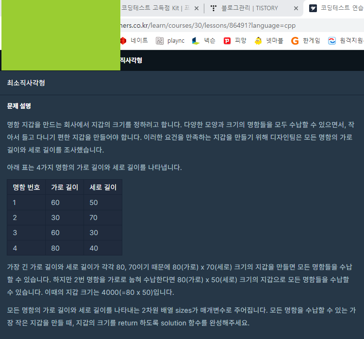 | [프로그래머스 고득점 kit] 최소 직사각형 (C++) (0) | 2023.01.10 |
