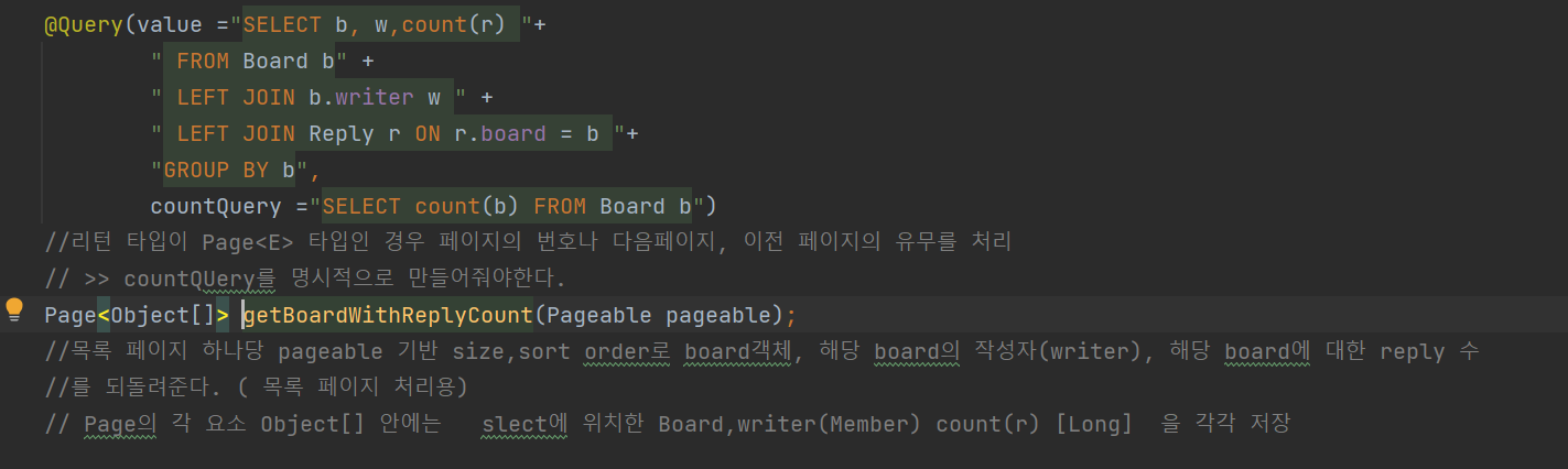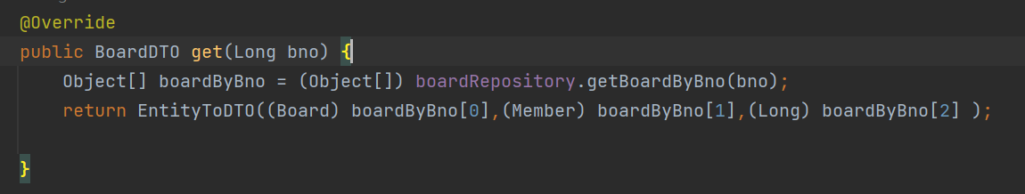 Object로 3가지 select된 객체 리턴받음>> Object[] 로 type cast하여 3개 추출.
