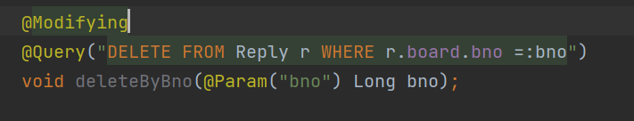 ReplyRepository에 Bno를 통해 해당 게시물에 대한 reply만 제거하는 modify 쿼리 작성